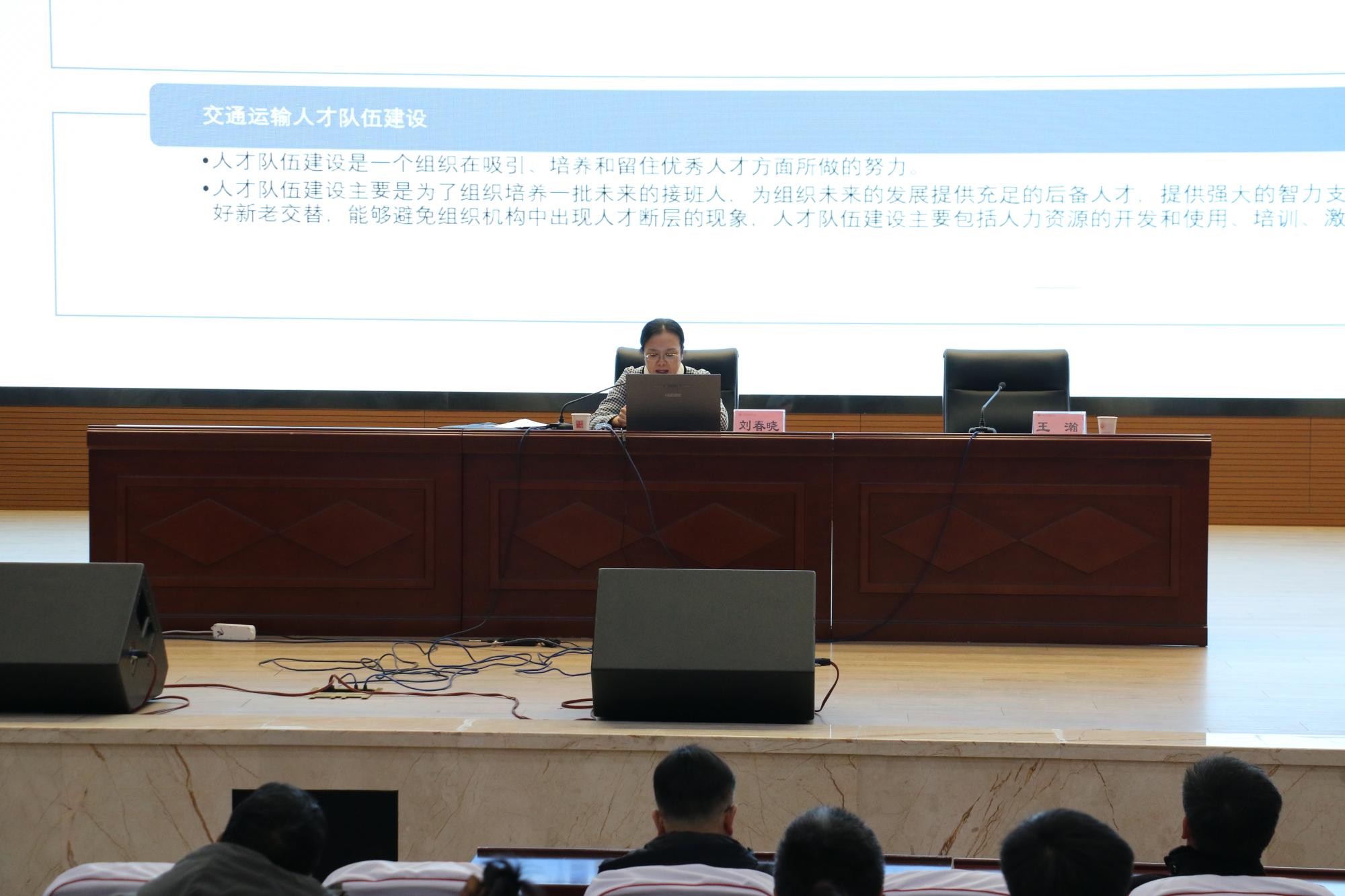 刘春晓从交通运输人才相关概念、行业人才管理、行业人才模范、职业技能竞赛等方面介绍了新疆交通运输行业人才概况。她就人才工作相关职责、政策为引,结合自身工作实际,对专业技术人才、专业技能人才、管理领导干部三支人才队伍建设要求、发展要求、创新能力举措,及自治区交通运输系统人才工作现状等进行了详细阐述。刘春晓从中央及交通运输部人才工作会议精神和人才工作目标要求、新疆自贸区建设带来的机遇、自治区交通运输厅三年人才行动计划等三个方面对交通运输行业人才队伍工作进行了展望。