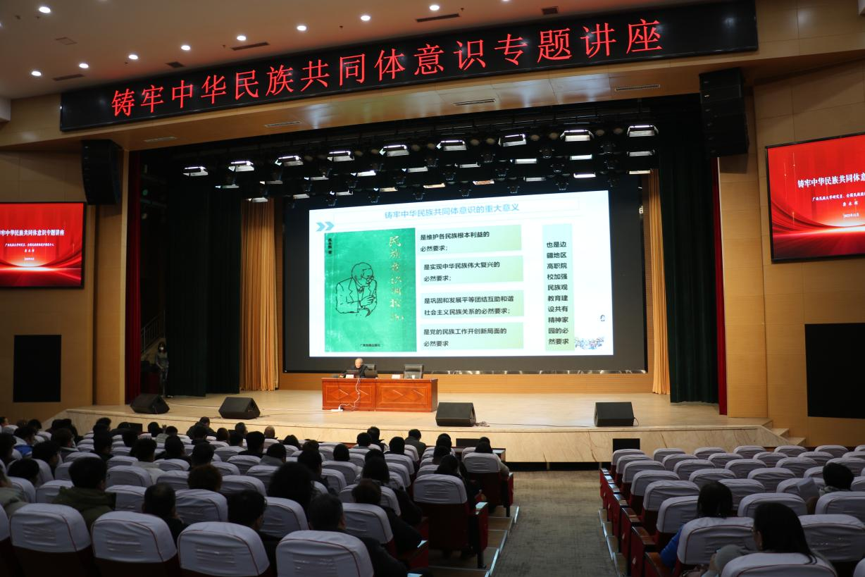 为深入学习贯彻习近平总书记关于民族工作的重要论述,增强师生对中华民族共同体的认同感与凝聚力,11月10日,学校党委统战部、天山英才教育教学名师工作室联合邀请广西民族大学民族学研究员、全国民族团结进步模范个人龚永辉,在产教融合楼大礼堂开展铸牢中华民族共同体意识专题讲座。校党委常委、统战部部长曹兴举出席并讲话,全校教职工及学生代表共同参加学习。