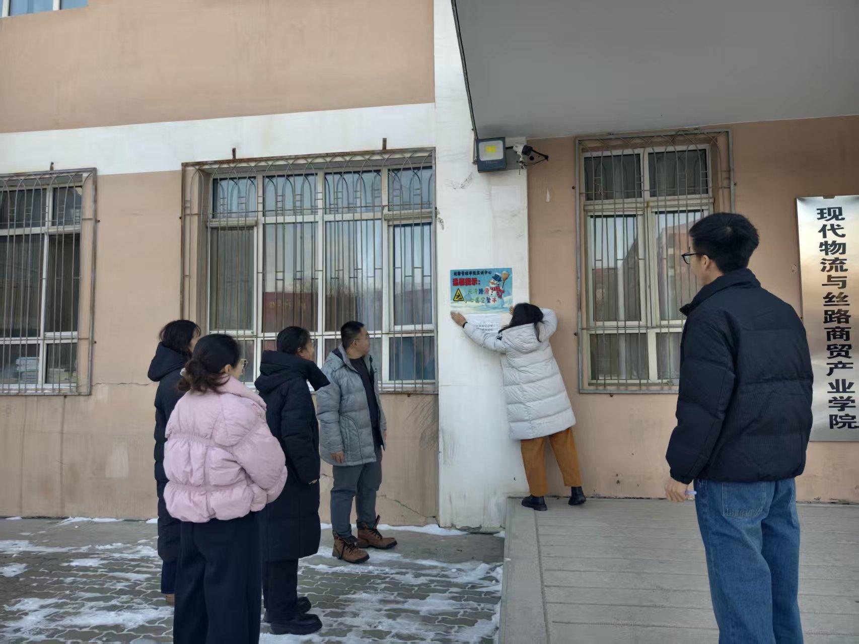 为应对冬季低温雨雪天气,保障师生出行安全,12月16日上午,运输管理学院组织实训中心教师,对物流实训楼、关务海事彩板房及周边区域开展冬季坠冰隐患清查专项行动。行动聚焦屋檐、房顶易形成冰棱部位及结冰湿滑路面,全面排查潜在风险,防患于未然。