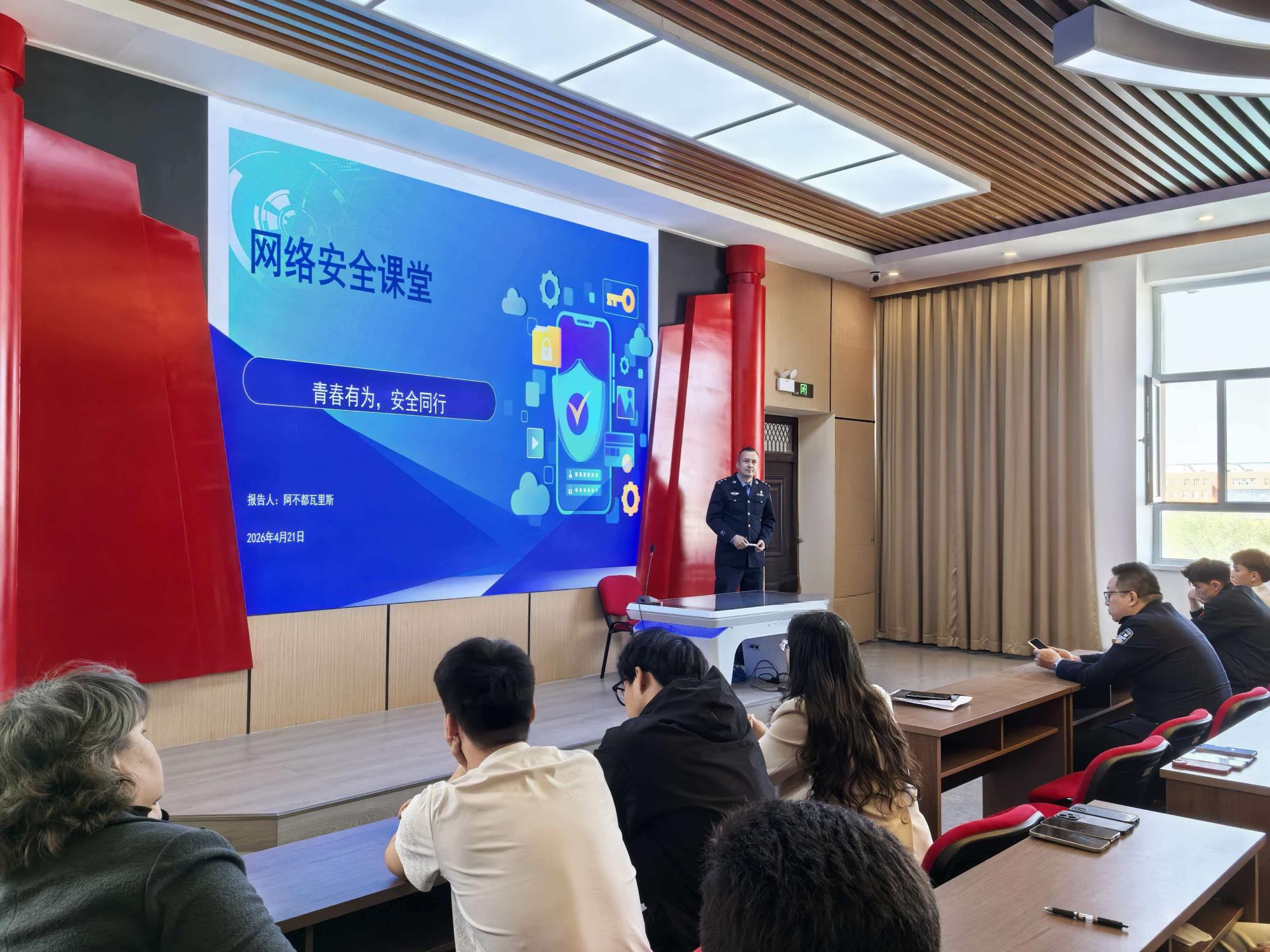 为进一步提升大学生网络安全意识和法治素养,4月21日,学校联合属地南路街道派出所,特别邀请米东区公安分局网络安全保卫大队教导员,为在校学生举办了一场别开生面、极具教育意义的网络安全专题讲座。