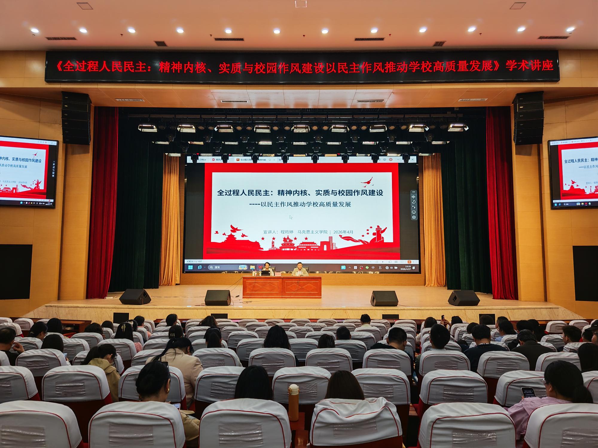 4月27日下午,学校在产教融合楼大礼堂举办《全过程人民民主:精神内核、实质与校园作风建设》专题学术讲座。本次讲座由马克思主义学院副教授程筠婷老师主讲,科研处处长毛伟主持。