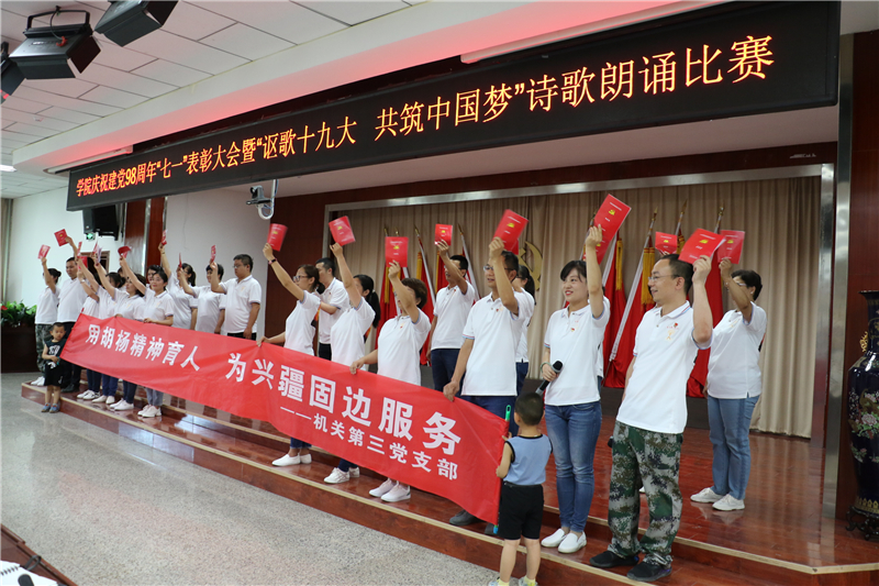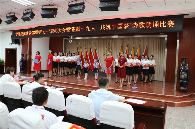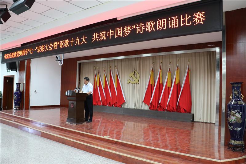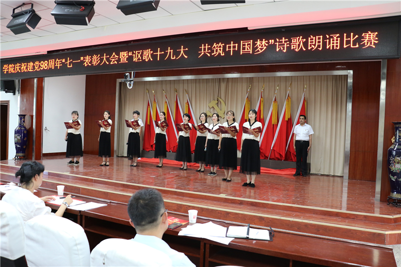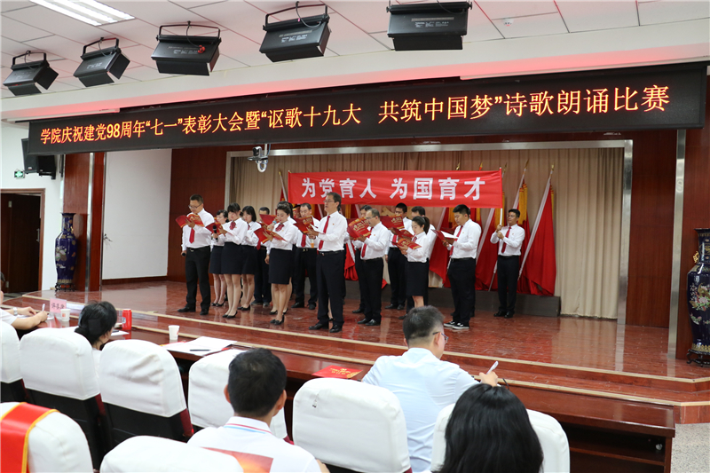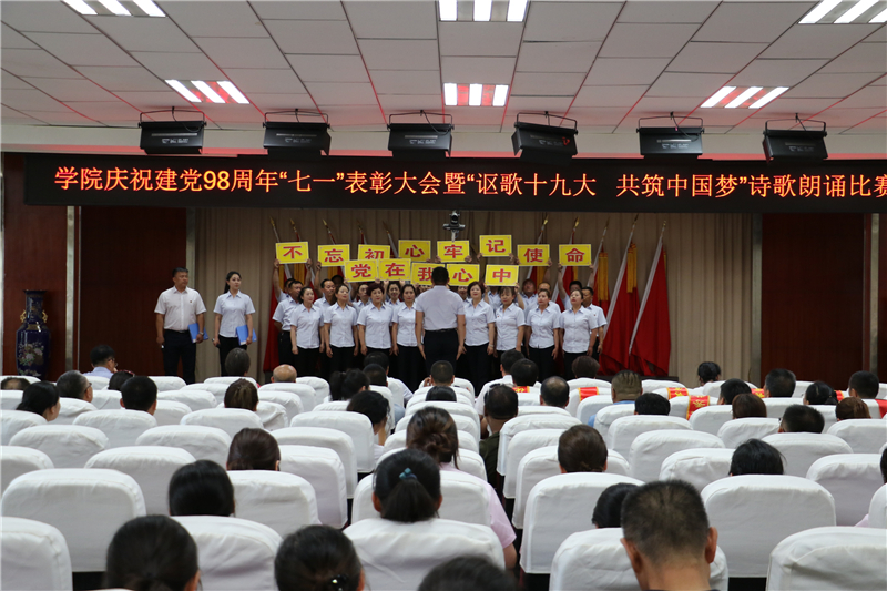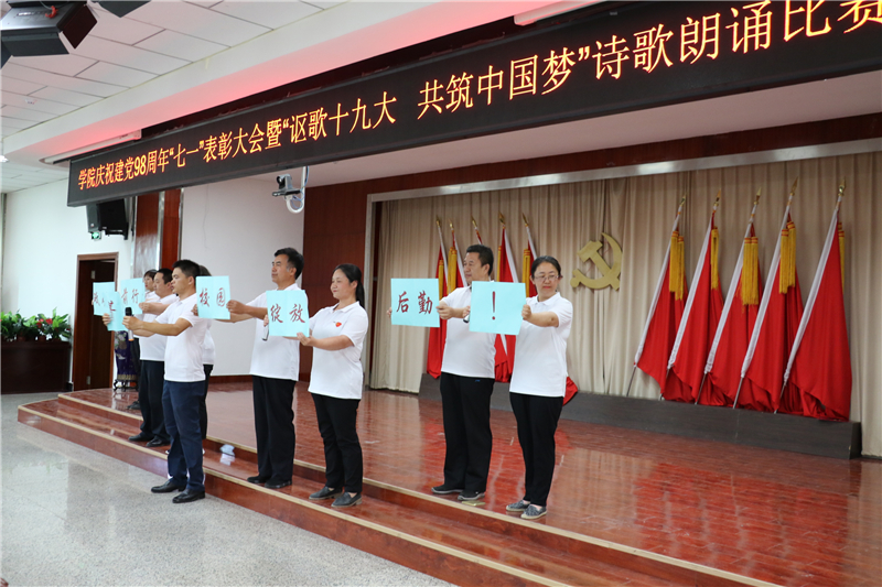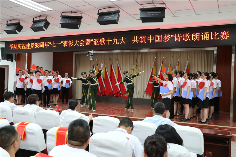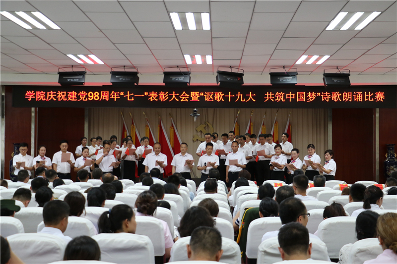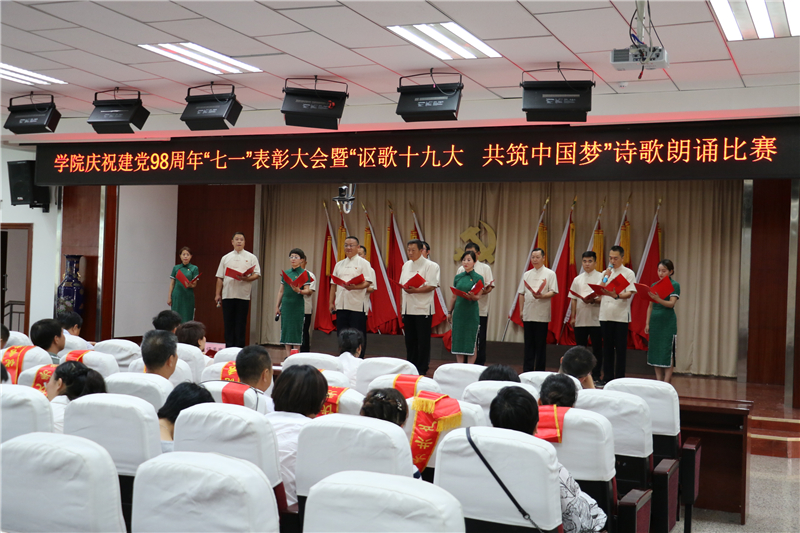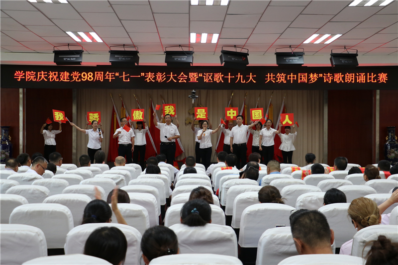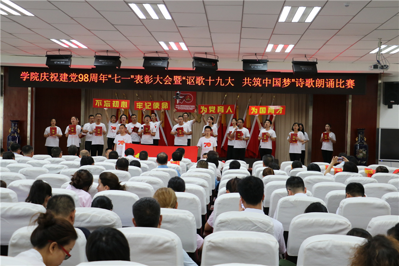 为庆祝中国共产党成立98周年,深入学习贯彻习近平新时代中国特色社会主义思想和党的十九大精神,进一步弘扬正气、树立标杆,唱响主旋律,弘扬正能量,提振精气神,努力构建“积极向上、清新高雅、健康文明”的校园文化,7月1日下午学院举办了庆祝建党98周年“七一”表彰大会暨“讴歌十九大 共筑中国梦”诗歌朗诵活动。
