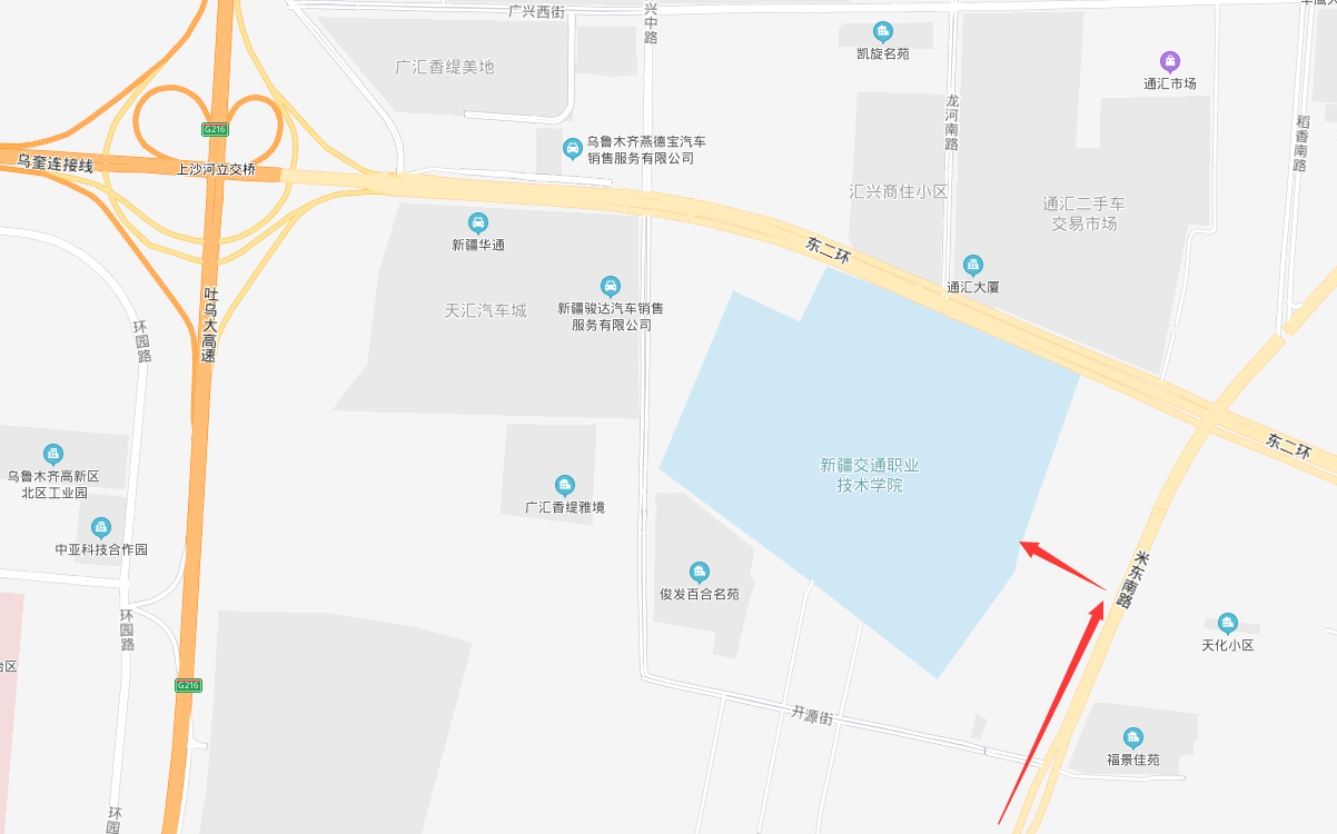 自驾车、搭乘私家车或出租车前往学院报到的家长和同学须沿吐乌大高速路向北行驶,进入米东南路,抵达新疆交通职业技术学院东门。