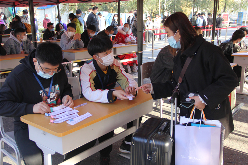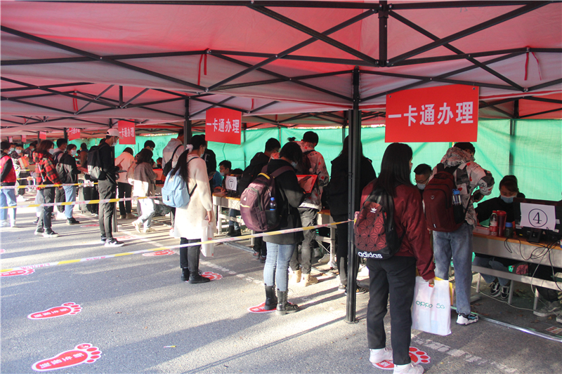 2020级新生报到点集中安排在学院的东大门口及东环校路,疫情防控标识、新生报到流程图、各二级学院专业介绍、道路指示牌在新生报到行进道路沿路展示,新生站点接待处、入学资格审查处、疫情防控处、行李安检处、新生资格审查处、校园一卡通及饭卡充值办理处、行李交费领取处等一条龙服务工作有序开展。每个环节均有志愿者热情悉心的为新生提供引导及咨询等服务。