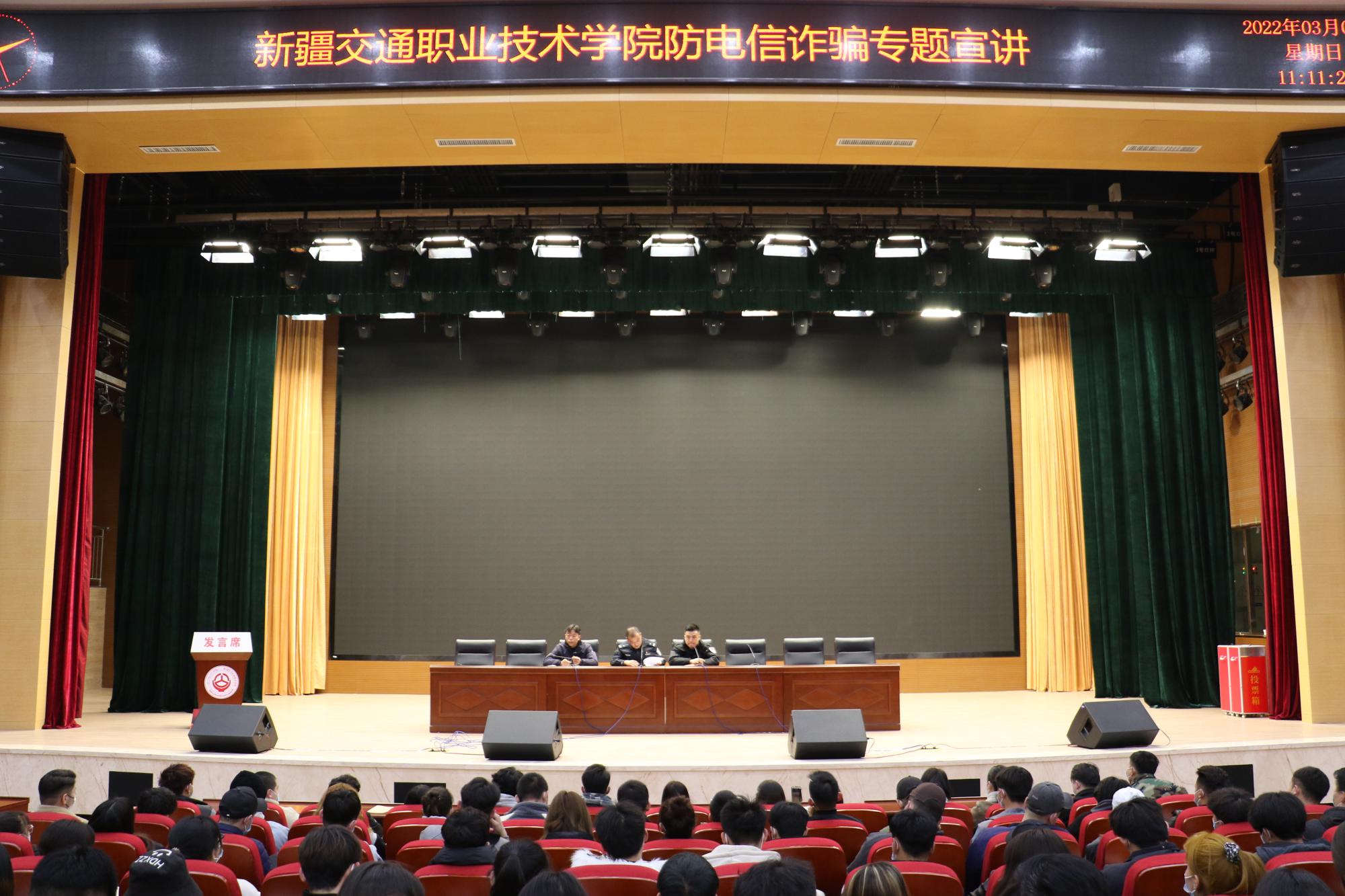为提高大学生识别和防范网络诈骗的能力,增强学生安全意识,加强校园安全建设,3月6日上午,学院在产教融合楼大礼堂开展了预防网络诈骗安全教育讲座,特邀米东南路派出所民警艾克巴尔·阿布都、舍超担任主讲,学院保卫处处长宋振强主持讲座。