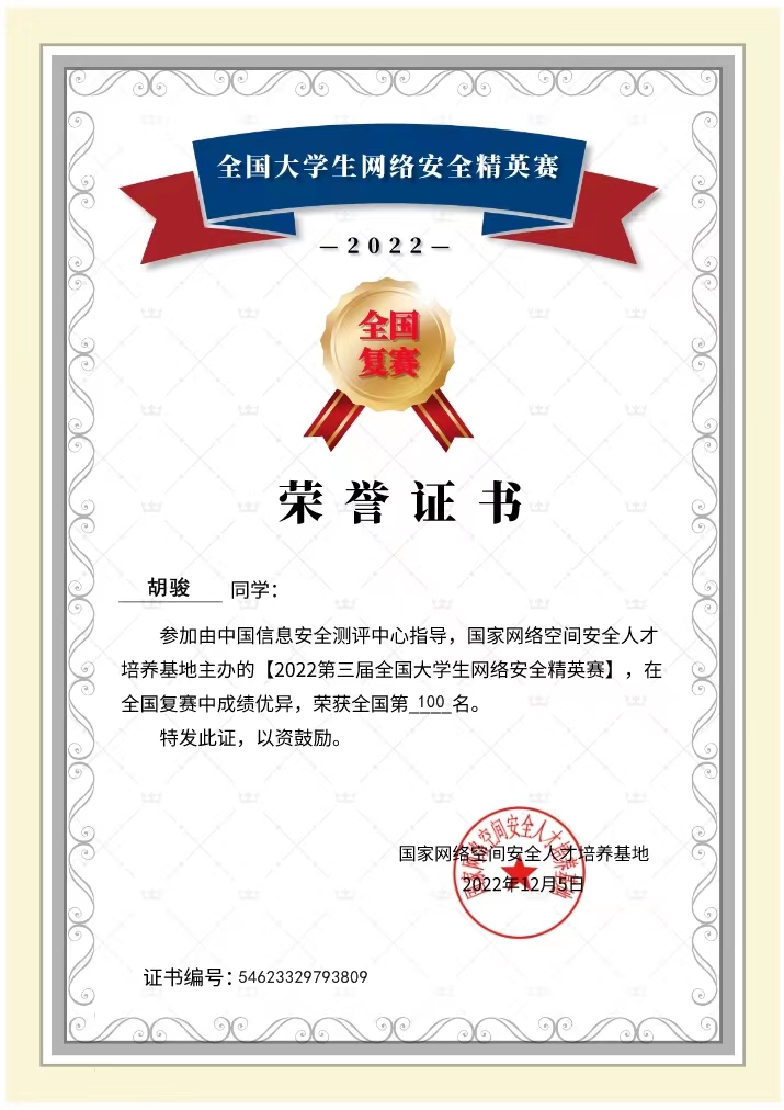 近日,第三届全国大学生网络安全精英赛正在如火如荼地进行,此次比赛由中国信息安全测评中心指导,国家网络安全空间人才培养基地主办。学院人工智能工程学院信息安全社社团成员胡骏同学在复赛中脱颖而出,成为新疆进入前一百名的唯一高职类院校选手,顺利晋级全国总决赛。