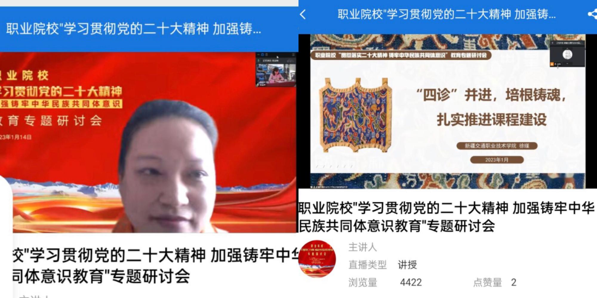 新疆交通职业技术学院马克思主义学院徐瑾副教授参会做了题为《“四诊”并进,培根铸魂,扎实推进课程建设》交流发言。从“以党的二十大精神为指引,筑牢课程建设理论根基”“‘四诊’并进,培根铸魂,扎实推进课程建设”“思政课程建设的寄语和希望”三个方面,对铸牢中华民族共同体意识重大论断的形成与发展,《简明新疆地方史教程》课程的沿革和当前开设的重要性,以及课程在建设中形成具有推广价值的成果进行了分享,为推动学院有效开展铸牢中华民族共同体意识教育奠定了坚实基础。